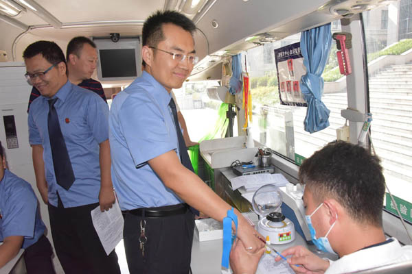 8月17日下午,市检察院志愿者开展爱心无偿献血活动。下午三点半,市中心血站献血车来到市检察院机关楼前,早早等候在此的志愿者们登上献血车。
